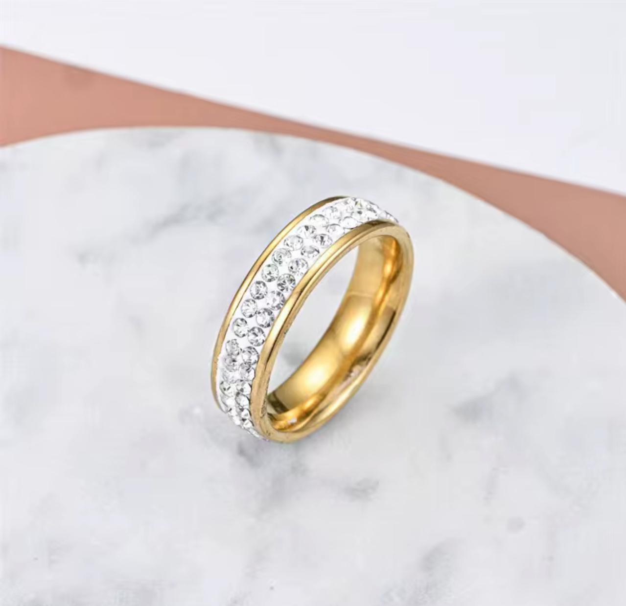 Radiate timeless elegance with this luxurious gold-plated diamond band ring. Adorned with a full row of shimmering crystals, it perfectly blends sophistication and sparkle. The smooth golden edges enhance its regal charm, making it an ideal choice for both everyday glamour and special occasions.