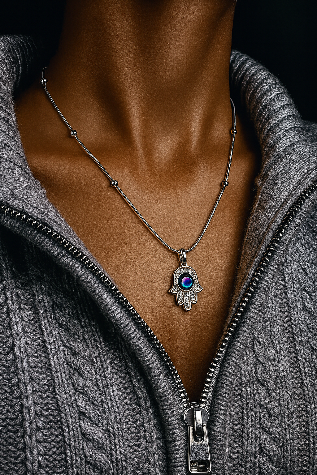This jewelry set features the powerful Evil Eye symbol, known for shielding against negativity and attracting good energy. The deep blue stone at the center represents clarity, strength, and protection, while the silver Hamsa design adds an extra layer of spiritual meaning — symbolizing blessings, luck, and safety.