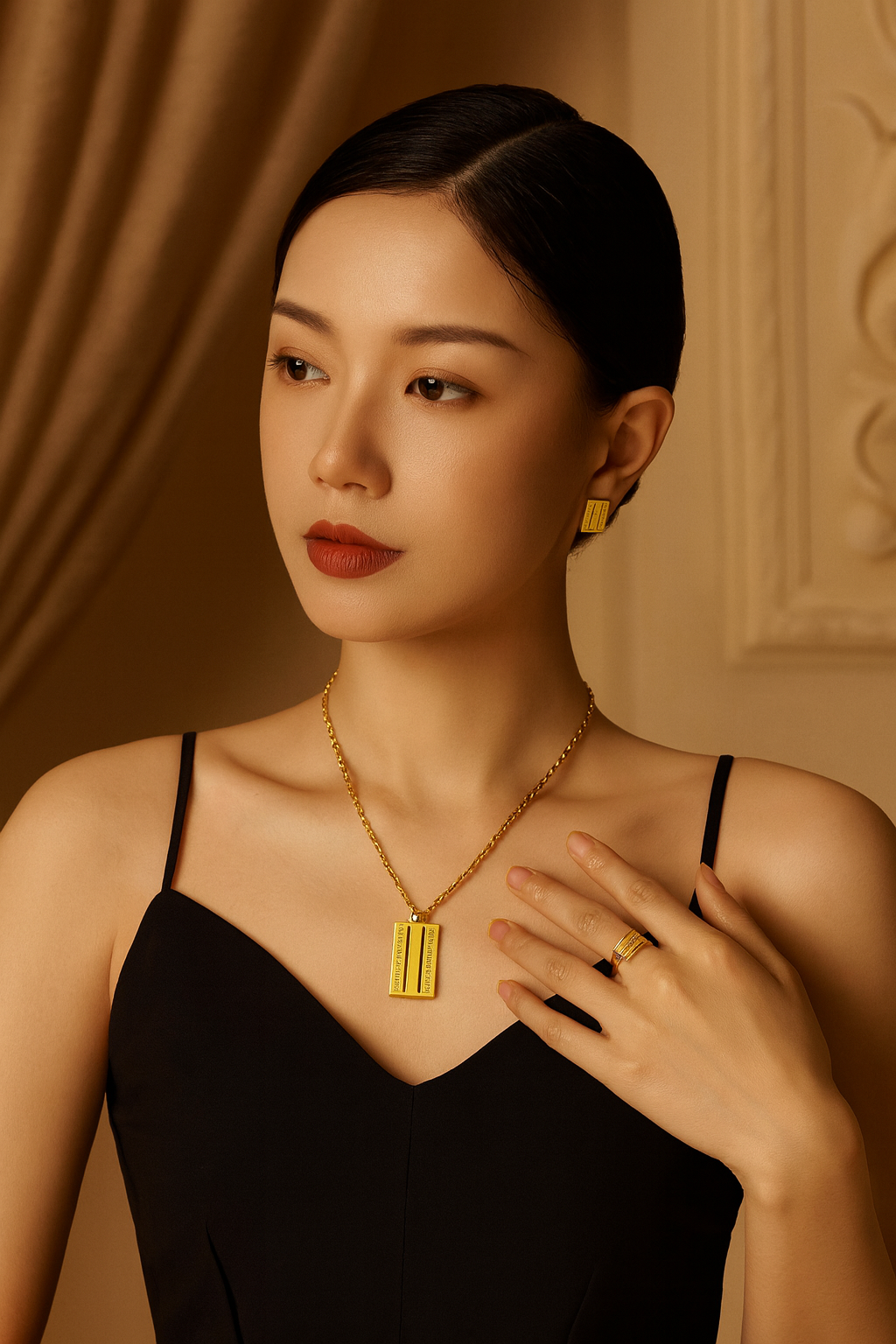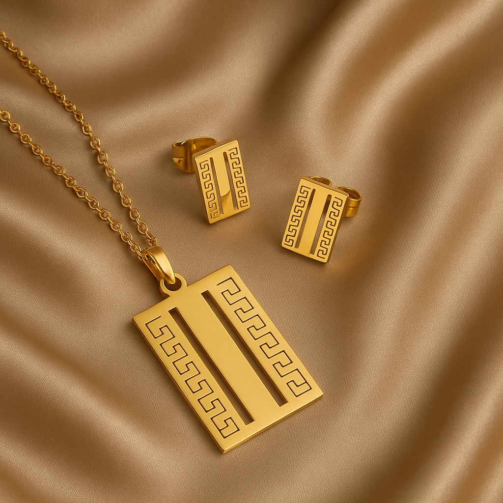 Elevate your style with this luxurious gold-plated jewelry set, featuring a bold rectangular pendant and matching stud earrings. Crafted with precision, each piece showcases an elegant