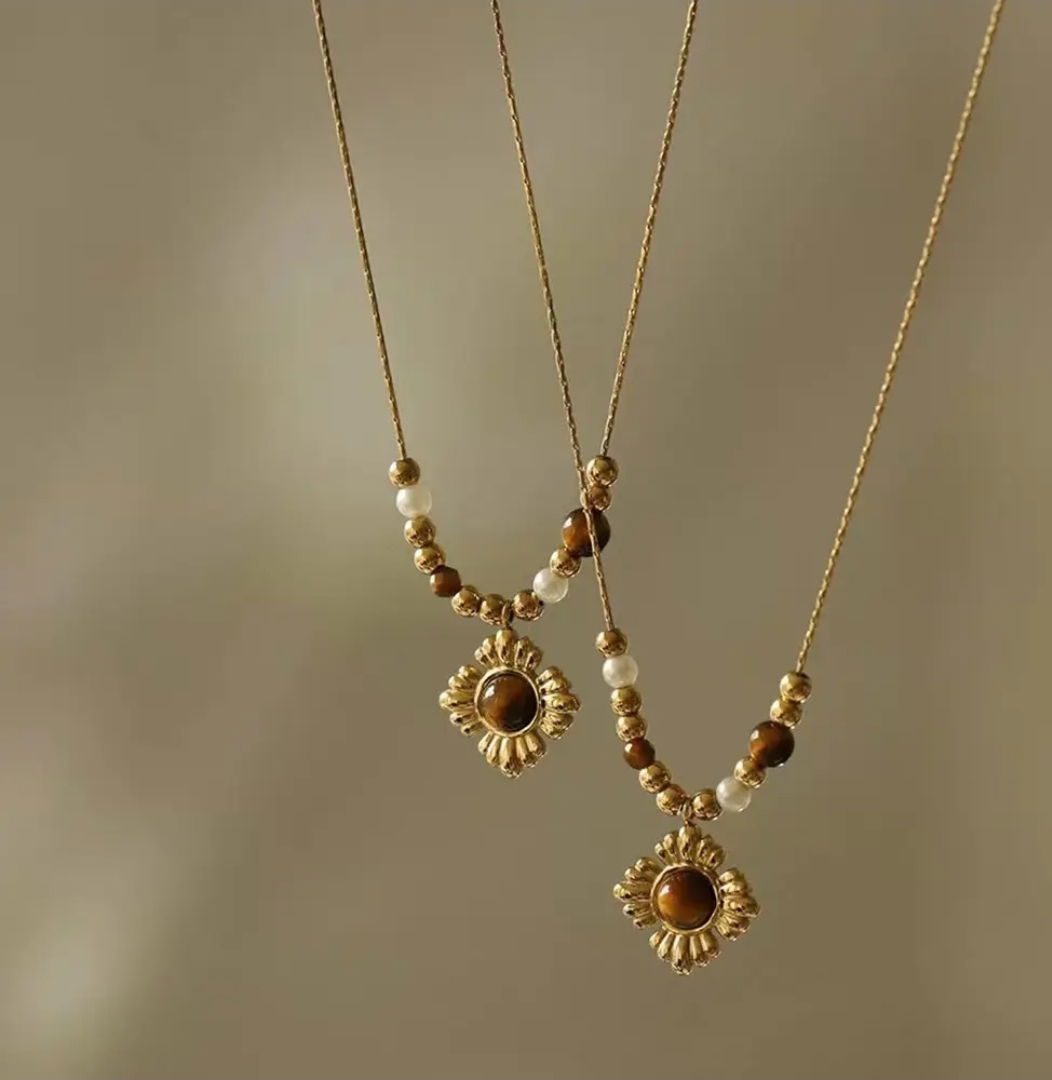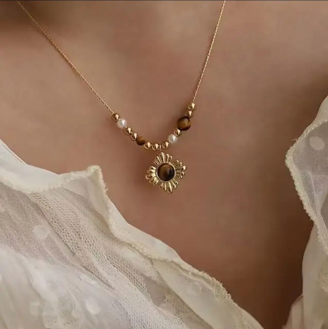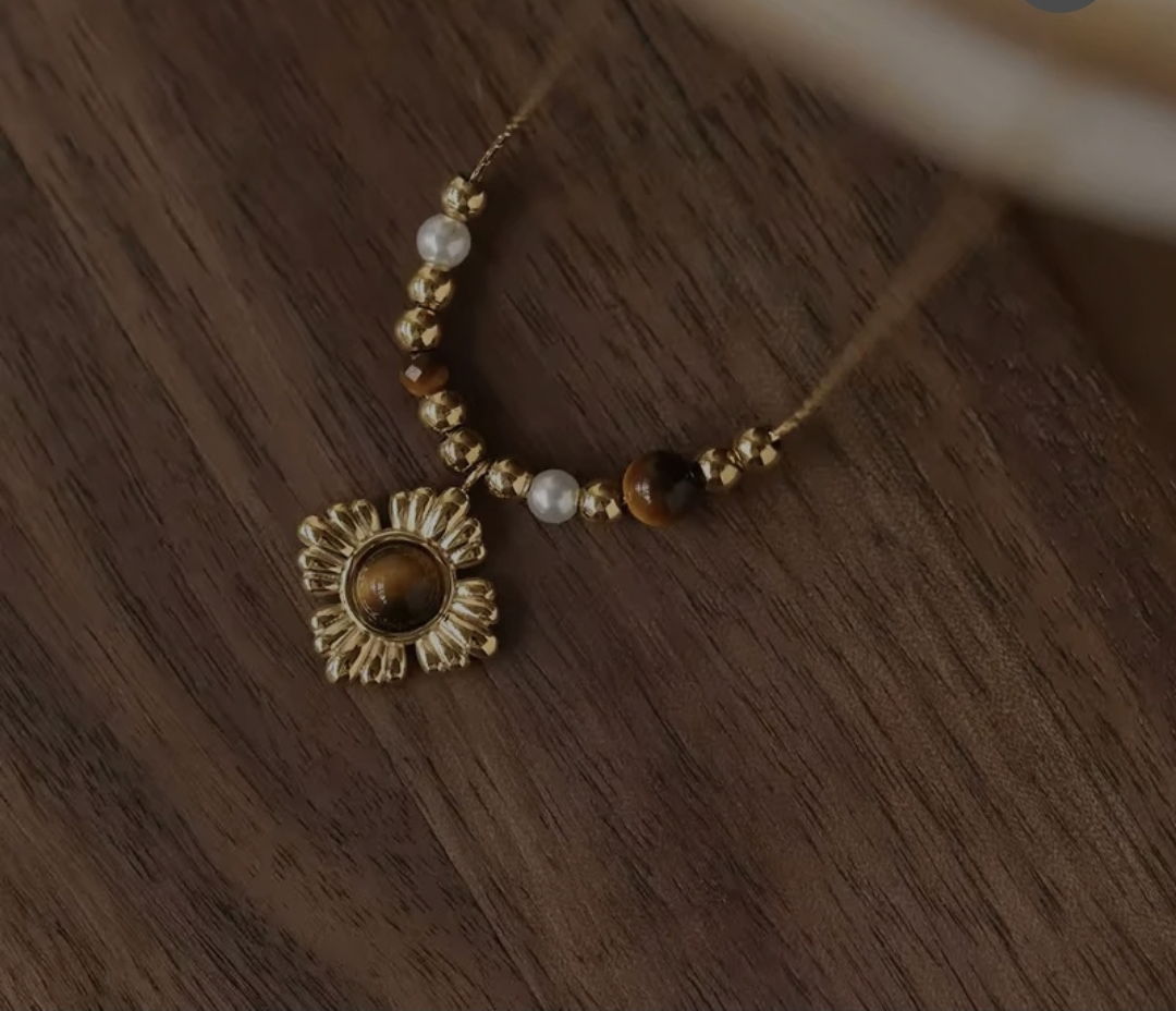Radiate timeless elegance with our Golden Sun Tiger Eye Necklace, a stunning fusion of luxury and nature. Handcrafted with precision, this exquisite piece features a captivating Tiger Eye gemstone????known for its grounding energy and golden shimmer—encased in a beautifully detailed sun-inspired pendant. The necklace is accentuated with polished gold beads and soft pearls, creating a perfect balance of warmth and sophistication.